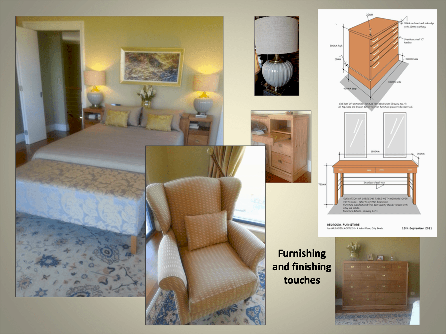 Sourcing and recommending all finishes, fittings, colour schemes, soft furnishings, furniture, design of cabinetwork to include bathroom, kitchen and any built in furniture units, selection of appliances and objet d’art etc necessary for completion of your interiors.